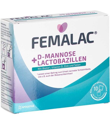 Anwendungsgebiet von FEMALAC D-Mannose + Lactobazillen FEMALAC® D-Mannose + Lactobazillen – das Wohlfühl-PlusVereint gezielt abgestimmte Mikronährstoffe und funktionelle Bestandteile – abgestimmt auf den täglichen Bedarf:Biotin¹ trägt zum Erhalt normaler Schleimhäute bei – darunter fallen auch die Schleimhäute im Intimbereich (zum Beispiel Blase und Scheide).Vitamin D², Zink² und Selen² leisten jeweils einen Beitrag zur normalen Funktion des Immunsystems⁴,⁵,⁶.• Enthalten sind außerdem Milchsäurebakterien (Lactobacillus rhamnosus & Lactobacillus reuteri) sowie pflanzlich gewonnene D-Mannose.• Die Darreichung als lösliches Trinkpulver ermöglicht eine einfache Anwendung – bis zu 2-mal täglich.FEMALAC®: Mit ausgewählten Inhaltsstoffen für Ihr WohlbefindenDas FEMALAC® Pulver vereint verschiedene Stoffgruppen in einem Produkt – darunter pflanzliche Zucker, probiotische Kulturen, Vitamine und Spurenelemente. Die Auswahl der Inhaltsstoffe unterstützt Körperfunktionen, die im Rahmen einer ausgewogenen Ernährung wichtig sind.D-Mannose: Diese Zuckerart ähnelt Glucose in ihrer Struktur und wird in FEMALAC® aus Mais gewonnen.Milchsäurebakterien: Enthalten sind Lactobacillus rhamnosus und Lactobacillus reuteri – Bakterienstämme, wie sie auch in fermentierten Lebensmitteln vorkommen.Biotin: Das Vitamin Biotin trägt zur Erhaltung normaler Schleimhäute bei.³ Dazu zählen auch die Schleimhäute im Intimbereich, wie zum Beispiel in Blase und Scheide.Vitamin D: FEMALAC® liefert Vitamin D – ein fettlösliches Vitamin, das der Körper sonst hauptsächlich durch Sonnenlicht bildet und das eine unterstützende Rolle für das normale Immunsystem spielt.⁴Zink: Zink gehört zu den Spurenelementen, die der Körper täglich benötigt. Es ist an vielen Prozessen beteiligt und unterstützt die normale Funktion des Immunsystems.⁵Selen: Auch Se ...