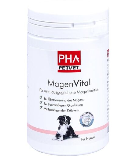 Anwendungsgebiet von Pha Magenvital Pulver F.hundeHundebesitzer beobachten häufig, dass ihre Vierbeiner Gras fressen und anschließend gelblichen Schleim herauswürgen. Dieser Vorgang kann unter anderem auf Magen-Darm- Probleme zurückgeführt werden und deutet auf eine Übersäuerung des Magens hin. Pha Magenvital Pulver F.hunde enthält eine ausgewählte Mischung an beruhigenden Kräutern, die bei derartigen Magenbeschwerden eingesetzt werden. Der kohlensaure Algenkalk dient als Puffersubstanz, die einer Magenübersäuerung entgegenwirkt. Zudem zeichnet sich der Kalk durch einen hohen Gehalt an Calcium aus, das für den Knochenbau und die Zähne essenziell ist. Das enthaltene Bentonit bindet Wasser und Giftstoffe im Darm des Tieres und kann somit für deren Ausscheidung über den Kot sorgen. Das natürliche Mineral Klinoptilolith weist ebenfalls eine starke Adsorptionskraft auf und kann daher im Organismus gebildete Toxine und Keime auf natürliche Weise über den Magen-Darm-Trakt ausschleusen. Pha Magenvital Pulver F.hunde kann der Übersäuerung des Hundemagens vorbeugen und so eine ausgeglichene Magen-Darm-Funktion begünstigen.