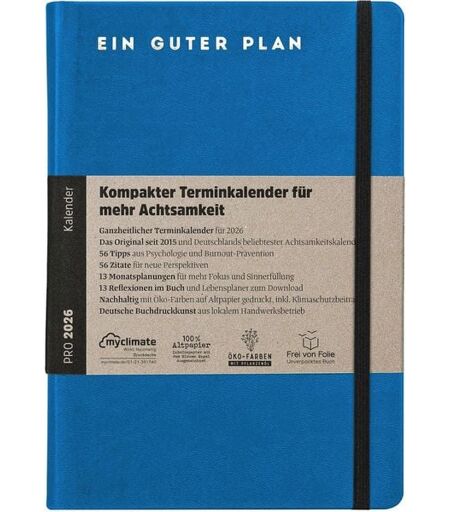 ACHTSAMKEITSFELS IN DER ALLTAGSBRANDUNG – Der ganzheitliche Terminkalender Ein guter Plan Pro 2026 bringt Fokus, Struktur und Entschleunigung in deinen Alltag. Dank kompakten Format, robustem Kunstledereinband, Gummiband und Froschtasche ist der Planer dein treuen Begleiter für ein Jahr voller Selbstliebe und Entschleunigung. STRUKTURIERTE PLANUNG – Mit gleich zwei Doppelseiten pro Woche bietet der Terminplaner Platz für wirklich alles, was in deinem Kopf herumschwirrt. In der vertikalen Wochenansicht inkl. Stundenraster planst du Termine, achtest auf deine Bedürfnisse und vermeidest Stress. Neben ausreichend Platz für Notizen und To-dos erlernst du mit wöchentlichen Tipps anwendbares Wissen über Achtsamkeit und Burnout-Prävention. Das Kalendarium läuft von Mitte Dezember 2025 bis Anfang Januar 2027. TIEFE SELBSTREFLEXION – Halte jeden Monat inne, reflektiere das Erlebte und plane die nächsten Wochen. So übst du dich in Dankbarkeit und stärkst deinen Fokus. Einen umfangreichen Lebensplaner mit über 40 fundierten Reflexionstechniken gibt es als kostenlosen Download dazu. Echte Erkenntnisse frei von Kitsch und Selbstoptimierungsdruck garantiert. NACHHALTIGE PRODUKTION INKL. KLIMAKOMPENSATION – Wir drucken ausschließlich mit zertifizierten Ökofarben auf 100 % Altpapier (Blauer Engel) und schweißen unsere Bücher nie in Plastik ein. Die gesamte Produktion erfolgt in lokalen Handwerksbetrieben in Deutschland (made in Germany). VERLAG MIT HALTUNG – Wir sind ein kleiner Verlag aus Berlin und seit 2015 das Original für Achtsamkeitskalender und -journals. Unsere Awards-prämierten Bücher werden regelmäßig von Therapeut*innen empfohlen und sind das perfekte Geschenk für mehr Halt in der Wel ...