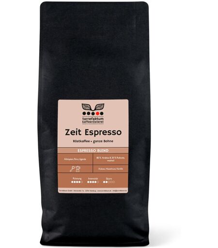 Torrefaktum - Espresso ZEIT Café - 1 kg Ganze Bohne Aufbewahrungshinweise: Trocken, dunkel und vor Wärme geschützt lagern. Zubereitungsempfehlung: Für unseren Espresso ZEIT Café empfehlen wir die Zubereitung in der Siebträgermaschine. Er eignet sich besonders gut als Espresso oder als Basis für ein Milchgetränk, wie Cappuccino oder Flat White. Das ist unser persönliches Brührezept: 1. Stelle die Wassertemperatur deiner Siebträgermaschine auf 94°C ein. 2. Wir empfehlen ca. 9-10 g Kaffee. Am besten du mahlst den Kaffee frisch mit der Handmühle oder einer elektrischen Kaffeemühle. Wähle einen feinen Mahlgrad. 3. Nutze den Tamper, um das Kaffeepulver festzudrücken und spanne den Siebträger ein. Starte danach direkt den Brühvorgang. 4. Bei 9-10 g Kaffee, sollten 25 g Kaffee wieder aus der Siebträgermaschine rauslaufen. Insgesamt sollte der ganze Brühvorgang in 25 - 30 Sekunden abgeschlossen sein.Für unseren Espresso ZEIT Café empfehlen wir die Zubereitung in der Siebträgermaschine. Er eignet sich besonders gut als Espresso oder als Basis für ein Milchgetränk, wie Cappuccino oder Flat White. Das ist unser persönliches Brührezept: 1. Stelle die Wassertemperatur deiner Siebträgermaschine auf 94°C ein. 2. Wir empfehlen ca. 9-10 g Kaffee. Am besten du mahlst den Kaffee frisch mit der Handmühle oder einer elektrischen Kaffeemühle. Wähle einen feinen Mahlgrad. 3. Nutze den Tamper, um das Kaffeepulver festzudrücken und spanne den Siebträger ein. Starte danach direkt den Brühvorgang. 4. Bei 9-10 g Kaffee, sollten 25 g Kaffee wieder aus der Siebträgermaschine rauslaufen. Insgesamt sollte der ganze Brühvorgang in 25 - 30 Sekunden abgeschlossen sein. Geschmack > Geschmacksprofil: Schokolade, Karamell, Bergamotte, Orangenmarmelade Spezialitätenkaffee von der Rösterei Torrefaktum aus HamburgGeschmacksprofil: Schokolade, Karamell, Bergamotte, OrangenmarmeladeBlend mit 30% Arabica-Bohnen aus Äthiopien, 50% Arabica-Bohnen aus Brasilien und 20% Robusta-Bohnen aus UgandaHerkunft: Verschiedene Kooperativen (Äthiopien, Uganda), Fazenda Dutra (Brasilien)Aufbereitung: washed (Äthiopien), natural (Brasilien, Uganda)Varietät: Mixed Heirloom (Äthiopien), Red & Yellow Catuaí, Red & Yellow Catucaí, Red & Yellow Bourbon, Geisha, Yellow Pacamara (Brasilien), Canephora (Uganda) ...