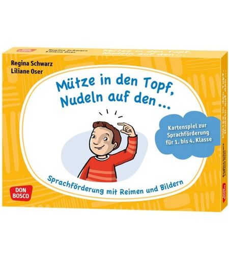 Frösche auf das Dach und Zucker in den See? Mit Spaß phonologisches Bewusstsein fördern Stöckchen in den Mund, Rotkohl für den ...? Konfetti für den Fisch, Würmer auf den …? Die Paarreime in diesem Spiel zur Sprachförderung müssen keinen Sinn ergeben – sie müssen bloß Spaß machen! Aber jedem Quatschreim fehlt am Ende der zweiten Zeile das passende Reimwort. Diese Reimwörter sind auf den Illustrationskarten abgebildet und die Aufgabe der Kinder ist es, die Karten einander zuzuordnen: Kichern ist selbstverständlich erlaubt! Regina Schwarz hat Nonsens-Verse zusammengestellt, die für viel Spaß sorgen und Sprachförderung zur unterhaltsamen Beschäftigung in der Gruppe oder allein machen. Paarreime ohne Sinn, aber mit viel Sprachwitz: Ein Sprachspiel für Kinder im Grundschulalter Perfekt auch für Logopädie-Übungen Mit lustigen Quatschreimen das phonologische Bewusstsein fördern Kartenset mit Reimen und Bildern inkl. Begleitheft mit Spielvorschlägen Spielerische Sprachförderung zu Hause und in der Schule: Sprachwitz trifft Sprachrhythmus Reime finden, Karten zuordnen: Deutsch-Lernspiele mit Humor Welche Bildkarte passt zu welchem Reim? Gibt es weitere Reime, um die ersten Zeilen weiterzuführen? Die witzigen, unsinnigen gereimten Sätze in diesem Sprachspiel sind genau das Richtige, um Grundschulkinder für das Experimentieren mit Wörtern zu faszinieren. Sprachförderung mit Reimen: Begeistern Sie Kinder mit diesem Spiel für phonologische Bewusstheit und lassen Sie sich auf den Spaß mit Nonsens-Versen ein! Don Bosco Verlag für Pädagogik Bildkarten, Kamishibai oder Fachbücher für Erzieherinnen und Pädagogen: Wir unterstützen Sie in Ihrer täglichen Arbeit mit kreativen Ideen, fundiertem Know-how und praxisnahen Produkten. Unser Qualitätsversprechen Die Materialien von Don Bosco Medien werden von erfahrenen Pädagoginnen und Pädagogen entwickelt und von unserem Fach-Lektorat umfassend geprüft. Unsere Produkte stehen für ganzheitliche Bildung und Erziehung, bei der das Kind immer im Mittelpunkt steht. ...