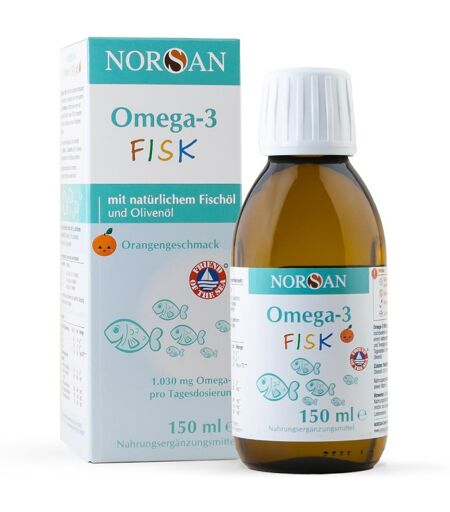 Anwendungsgebiet von Norsan Omega-3 Fisk für Kinder flüssigNorsan Omega-3 Fisk für Kinder flüssig ist speziell entwickelt für Kinder und Jugendliche, aber auch für Erwachsene geeignet. Es enthält eine Kombination aus natürlichem Fischöl (reich an EPA) und Dorschöl (reich an DHA), ergänzt durch kaltgepresstes polyphenolreiches Olivenöl als Antioxidans. Der angenehme Orangengeschmack macht das Öl besonders bei Kindern beliebt.Die Tagesdosierung variiert je nach Körpergewicht. Eine Tagesdosis von 5 ml, entspricht ca. 1 Teeeloffel liefert 1.030 mg Omega-3-Fettsäuren (EPA und DHA).Wirkstoffe / Inhaltsstoffe / ZutatenZutaten von Norsan Omega-3 Fisk für Kinder flüssig:Natürliches Fischöl (40 %), Natürliches Dorschöl (40 %), Olivenöl (19,9 %), Orangenöl, gemischte und d-α-Tocopherole, Cholecalciferol.Nährwerte pro 5 mlFischöl: 1,8 g *Dorschöl: 1,8 g*Olivenöl: 0,9 g *Vitamin D3: 10 µg **Vitamin E: 3,6 mg α-TE ***Zusammensetzung der Fettsäuren- mehrfach ungesättigte Fettsäuren: 1,2 g *- Omega-3-Fettsäuren: 1.030 mg *davon:EPA: 448 mg *DPA: 56 mg *DHA: 382 mg ** kein Referenzwert vorhanden gemäß VO (EU) Nr. 1169/2011** 200 % des Referenzwertes gemäß VO (EU) Nr. 1169/2011*** 30 % des Referenzwertes gemäß VO (EU) Nr. 1169/2011GegenanzeigenBei bekannter Überempfindlichkeit gegenüber einem der oben genannten Inhaltsstoffe sollte dieses Produkt nicht angewendet werden. DosierungVerzehrempfehlung von Norsan Omega-3 Fisk für Kinder flüssig:Die Tagesdosierung variiert je nach Körpergewicht des Kindes:Bis 9 kg: Alle 2 Tage 2,5 ml (1/2 Teelöffel) enthält 257 mg Omega-3-Fettsäuren pro TagBis 17 kg: 2,5 ml täglich (1/2 Teelöffel) enthält 515 mg Omega-3-FettsäurenBis 35 kg: 5 ml täglich (1 Teelöffel) enthält 1.030 mg Omega-3-FettsäurenVerzehrempfehlung ab Beikostreife bei gestilltem Säugling: Supplementierung über die Mütter.Für eine optimale Aufnahme im Körper wird empfohlen, das Öl in Verbindung mit (oder direkt na ...