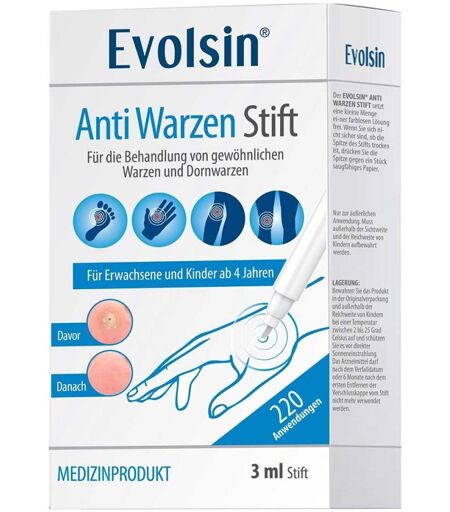 Anwendungsgebiet von Evolsin Anti Warzen StiftEvolsin Anti Warzen Stift ist für die Behandlung von Warzen an Füssen, Händen, Körper, Armen und Beinen geeignet. Das Produkt kann von Erwachsenen und Kindern ab 4 Jahren verwendet werden.Wirkungsweise von Evolsin Anti Warzen StiftEvolsin Anti Warzen Stift enthält Ameisensäure. Die Säure dringt in die Warze ein, trocknet sie von innen aus und sorgt nach einer gewissen Zeit für eine natürliche Ablösung. Wirkstoffe / Inhaltsstoffe / ZutatenInhaltsstoffe von Evolsin Anti Warzen Stift: