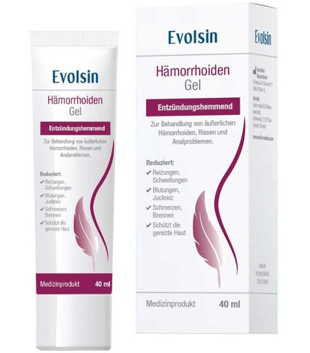 Anwendungsgebiet von Evolsin Hämorrhoiden GelEvolsin Hämorrhoiden Gel wird für die Behandlung von äußerlichen Hämorrhoiden und anderer kleinerer anorektaler Erkrankungen wie Analjucken und Fissuren angewendet. Evolsin Hämorrhoiden Gel reduziert Reizungen, Jucken, Schwellungen, Schmerz und Brennen und schützt die gereizte Haut vor den Kontakt mit Reizflüssigkeiten oder Stuhl aus dem Rektum.Wirkungsweise von Evolsin Hämorrhoiden GelEvolsin Hämorrhoiden Gel bildet eine Schutzschicht mit sehr guten feuchtigkeitsspendenden und entzündungshemmenden Eigenschaften. Diese Schicht schützt den Bereich um den Anus und stellt die strukturelle Integrität der Venen und den normalen Blutfluss im Bereich des Anus wieder her. Evolsin Hämorrhoiden Gel verringert das Infektionsrisiko, weil es verhindert, dass Bakterien in die Haut eindringen – es wirkt nicht antibakteriell. Evolsin Hämorrhoiden Gel hilft gegen die Vergrößerung bei vorgefallenen Hämorrhoiden und produziert einen Gleiteffekt für harten Stuhlgang.Wirkstoffe / Inhaltsstoffe / ZutatenEvolsin Hämorrhoiden Gel enthält: