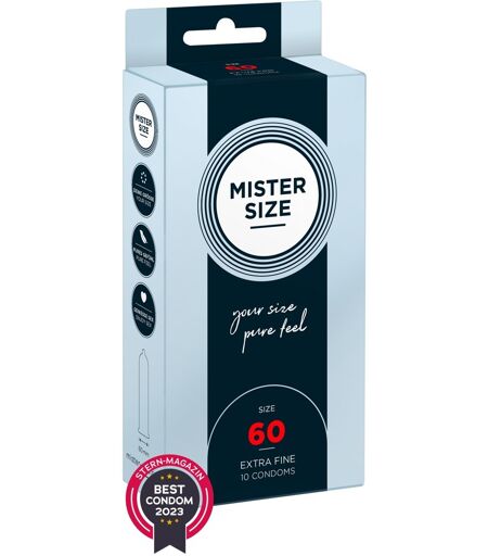 Transparente, hauchdünne Kondome Mister Size (60 mm) aus Naturkautschuklatex mit Gleitcreme-Beschichtung und Reservoir. Vegan. Auf der Vorderseite der Verpackung kann man/frau anhand der Breite des dunkelblauen mittigen Balkens die passende Kondomgröße für den Penis abschätzen. Größe 60 mm ist passend für einen Penisumfang von 13,5 bis 14,5 cm. ...