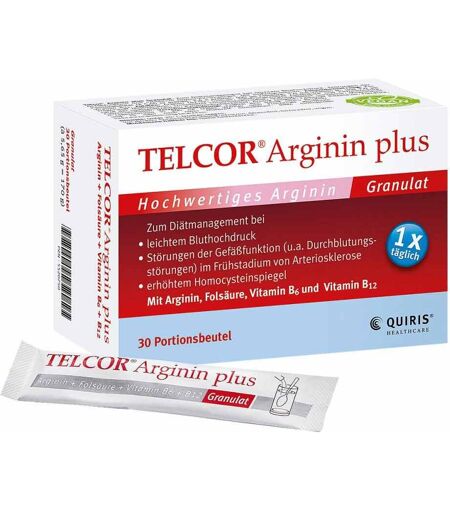 Telcor Arginin plus Beutel Granulat ist ein Lebensmittel für besondere medizinische Zwecke (bilanzierte Diät) und mit seiner besonderen Vitalstoffkombination aus natürlichem Arginin, Folsäure, Vitamin B6 und B12 zum Diätmanagement bei leichtem Bluthochdruck, gestörter Gefäßfunktion (u. a. Durchblutungsstörungen) im Frühstadium von Arteriosklerose und bei erhöhtem Homocysteinspiegel geeignet.