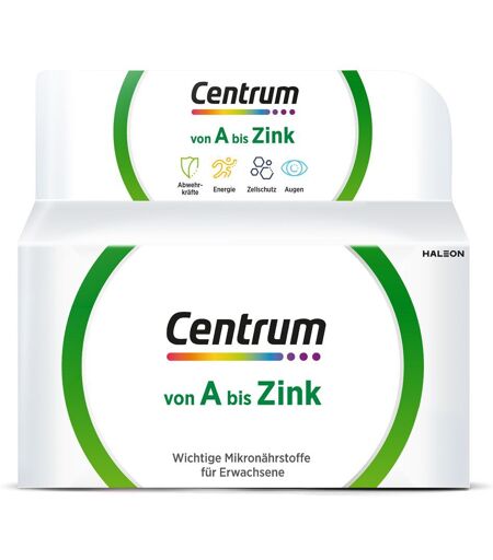 Nahrungsergänzungsmittel sind kein Ersatz für eine ausgewogene und abwechslungsreiche Ernährung und eine gesunde Lebensweise.Von A bis Zink: von Experten formulierter Allrounder, der die Ernährung täglich sinnvoll ergänzt. Mit Vitaminen, Mineralstoffen und Spurenelementen. Der hochwertige Allrounder Von A bis Zink versorgt Sie komplett mit lebensnotwendigen Vitaminen, Mineralstoffen und Spurenelementen Gesundheit und Wohlbefinden werden sinvoll mit Multivitaminen unterstützt. Die Centrum Verpackungen werden derzeit sukzessive auf ein neues Design umgestellt; während der Umstellungszeit sind beide Versionen im Umlauf. Die Tablettenfarbe ist etwas dunkler als zuvor. glutenfrei, laktosefrei, gelatinefrei Der menschliche Körper ist ein biologisches Meisterwerk in dem hochkomplexe Prozesse ablaufen für die Mikronährstoffe in ausreichender Menge benötigt werden. Die Centrum Nährstoff-Formel Von A bis Zink enthält alle lebensnotwendigen Vitamine sowie wichtige Mineralstoffe und Spurenelemente in einem ausgewogenen Verhältnis - zur optimalen Ergänzung Ihrer täglichen Ernährung. Mit nur einer Tablette pro Tag decken Sie den Tagesbedarf vieler Vitamine, Mineralstoffe und Spurenelemente. Das Ergebnis: Der Körper wird durch die mit Sorgfalt zusammengestellte Nährstoffformel ganzheitlich unterstützt. Abwehrkräfte: Vitamin C, Zink und Selen unterstützen die normale Funktion des Immunsystems. Gehirn: Eisen trägt zu einer normalen kognitiven Funktion und Pantothensäure zu einer normalen geistigen Leistung bei. Augen: Vitamin A trägt zur Erhaltung normaler Sehkraft bei. Vitalität und Energie: Vitamin B6 und B12 tragen zur Verringerung von Müdigkeit und Ermüdung bei. Knochen ; Gelenke: Vitamin D und Calcium tragen zur Erhaltung normaler Knochen bei. Haut ; Haare: Biotin trägt zur Erhaltung normaler Haut und Haare bei. Muskeln: Kalium und Magnesium tragen zu einer normalen Muskelfunktion bei. Zellschutz: Vitamin E und Kupfer tragen dazu bei, die Zellen vor oxidativem Stress zu schützen.Die Centrum Formulierungen werden auf Grundlage wissenschaftlicher Forschungen entwickelt und von Nährstoffexperten formuliert. Sämtliche Mikronährstoffe sind auf Sicherheit geprüft und zertifiziert. Centrum Von A bis Zink ist: - Für Diabetiker geeignet ohne Anrechnung von Broteinheiten (BE) - glutenfrei - laktosefrei- gelatinefreiZutaten:Calciumhydrogenphosphat; Magnesiumoxid; Füllstoffe: E 460, E 464, E 1200; L-Ascorbinsäure; Kaliumchlorid; DL-alpha-Tocopherylacetat; Nicotinamid; Eisen-II-fumarat; Trennmittel: E 470b, E 551, E 553b, E 1202; Calciumcarbonat; Calcium-D-Pantothenat; Zinkoxid; Mangan-II-sulfat; Pyridoxinhydrochlorid; Thiaminmononitrat; Riboflavin; Beta-Carotin; pflanzliche Öle (Kokos-, Palmkernöl); Kupfersulfat; Retinylacetat; D-Biotin; Pteroylmonoglutaminsäure; Chrom-III-chlorid; Natriummolybdat; Kaliumjodid; Natriumselenat; Phyllochinon; Cholecalciferol; Cyanocobalamin; Farbstoff: E 132. Nährwerte: Zusammensetzung pro Tablette % NRV * Vitamin A (RE) (50 % als... ...