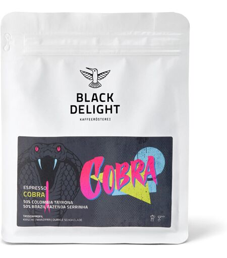 Black Delight - COBRA Blend Espresso - 250 g Ganze Bohne Aufbewahrungshinweise: Trocken, dunkel und vor Wärme geschützt lagern. Zubereitungsempfehlung: Für unseren COBRA Blend empfehlen wir die Zubereitung in der Siebträgermaschine. Er eignet sich besonders gut als Espresso oder als Basis für ein Milchgetränk, wie Cappuccino oder Flat White. Das ist unser persönliches Brührezept: 1. Stelle die Wassertemperatur deiner Siebträgermaschine auf 93°C ein. 2. Wir empfehlen 18 g fein gemahlenen Kaffee. Am besten du mahlst den Kaffee frisch mit der Handmühle oder einer elektrischen Kaffeemühle. 3. Nutze den Tamper, um das Kaffeepulver festzudrücken und spanne den Siebträger ein. Starte danach direkt den Brühvorgang. Wir empfehlen eine Brewratio von 1:2. Das bedeutet: Bei 18 g Kaffee, sollten 36 g Kaffee wieder aus der Siebträgermaschine rauslaufen. Insgesamt sollte der Brühvorgang in 25 Sekunden abgeschlossen sein. Geschmack > Geschmacksprofil: Kirsche, Marzipan, dunkle Schokolade Spezialitätenkaffee von der Rösterei Black Delight aus HamburgGeschmacksprofil: Kirsche, Marzipan, dunkle SchokoladeBlend mit 100% südamerikanischen Arabica-Bohnen: 50% Kolumbien, 50% BrasilienHerkunft: Kooperative ASOARHUACO in Kolumbien, Fazenda Capim Branco in BrasilienAufbereitung: washed (Kolumbien) / natural (Brasilien)Varietät: Typica, Bourbon, Caturra / Yellow Icatu, Red Catuai ...