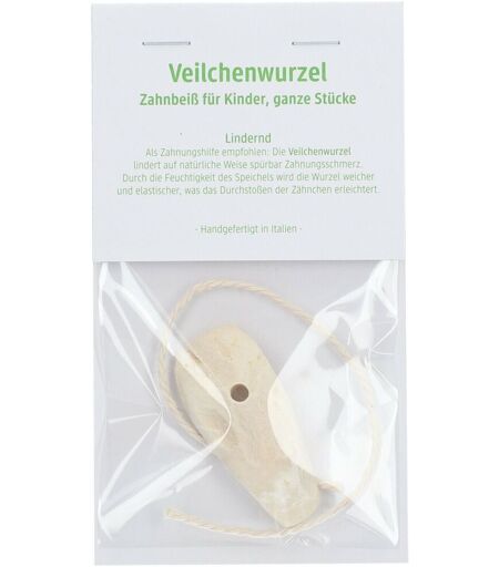 Veilchenwurzel Wurzel der Schwertlilie (Iris Florentina) Zahnbeiß für Kinder, ganze Stücke. Lindernd. Als Zahnsungshilfeempfohlen. Die Veilchenwurzel lindert auf natürliche Weise spürbar Zahnungsschmerz. Durch die Feuchtigkeit des Speichels wird die Wurzel weicher und elastischer, was das Durchstoßen der Zähnchen erleichtert. Hinweis: Aus Hygienegründen regelmäßig kurz in kochndes Wasser tauchen und gut lufttrocknen. Sicherheitshinweis: Veilchenwurzeln Babys und Kindern niemals lose in die Hand geben. Die Wurzeln müssen immer an einer Schnullerkette etc. befestigt sein. Beiliegende Kordel dient nur zum Befestigen der Veilchenwurzel. Bitte achten Sie darauf, dass Kinder unter 3 jahren bei kleinteiligen Dingen immer die Aufsicht eines Erwachsenen brauchen. Veilchenwurzeln sind kein Spielzeug! ...