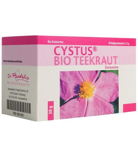 Bitte achten Sie auf eine abwechslungsreiche und ausgewogene Ernährung und gesunde Lebensweise.Cystus® Bio Tee (Zistrose Bio Tee und Cistus bio Tee) ist auch für Kinder, Schwangere und Stillende geeignet.Tipp:mit Zitrone und Honig verfeinern.Kalt gemischt mit Fruchtsäften oder als Eistee zubereitet ist der Cystus® Bio Tee ein ideales ErfrischungsgetränkVariation: Für einen besonders intensiven herb-aromatischen Geschmack gibt man das Teekraut mit kaltem Wasser in einen Kochtopf, bringt den Tee zum Sieden und läßt ihn ca. 5 Minuten mit aufgelegtem Deckel weiter köchelnZutaten:100% Cistus incanus L. Pandalis (Kraut)aus kontrolliert biologischem AnbauVerzehrempfehlung:Kräutertee: Pro Tasse einen Aufgußbeutel / einen Teelöffel (ca. 1,5 g) Cystus® Bio Teekraut mit kochendem Wasser übergießen und - je nach Geschmack – 7 bis 10 Minuten ziehen lassen.Die vorgesehene Tagesverzehrmenge beträgt 2 Tassen.Lagerung:Trocken aufbewahren.Nettofüllmenge:30 g = 20 Aufgußbeutel á 1,5 gHersteller:Naturprodukte Dr. Pandalis GmbH & Co. KGFüchtenweg 349219 Glandorf ...