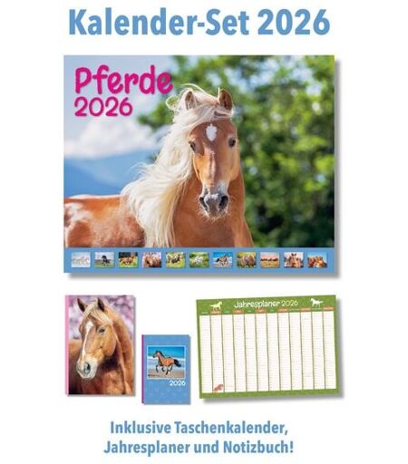 "Das ultimative Pferde Kalenderpaket 2026 – ein Muss für alle Pferdefreunde! ""Das Glück dieser Erde liegt auf dem Rücken der Pferde ..."" Jeden Monat erwartet Sie in dem Wandkalender 2026 ein neues, brillantes Pferdemotiv, begleitet von ausreichend Platz für Notizen und Termine. Aber das ist noch nicht alles – das 4-teilige Set enthält neben dem Wandkalender weitere praktische Artikel: einen Taschenkalender, einen Jahresplaner und ein Notizbuch, ebenfalls mit bezaubernden Pferdemotiven gestaltet. Ein vielseitiges Kalenderpaket – perfekt auch als Geschenkidee für Pferdefans. • Wandkalender, 35,5 x 57 cm • Taschenkalender, 96 Seiten, DIN A6 • Jahresplaner A2, 42 x 60 cm • Notizbuch, DIN A5 • Wundervolle Pferdemotive • Ideales Geschenk für Pferdefans " ...