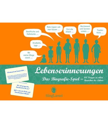 Lebenserinnerungen - Das Erinnerungsspiel Begeben Sie sich gemeinsam auf eine Reise durch die vielen Stationen des Lebens. 100 Karten zu allen Abschnitten des Lebens lassen Erinnerungen wieder lebendig werden. „Wo meine Wiege stand, da ist mein Heimatland“; „Backfische und Halbstarke“; „Wochenend und Sonnenschein“; „ Rote Lippen soll man küssen“ … „Lebenserinnerungen“ ist das heiter-nostalgische Spiel, dass die schönen Momente im Leben wieder lebendig werden lässt. Erinnern Sie sich gemeinsam, an die vielen Mosaiksteine, die das Leben ausmachen. ...