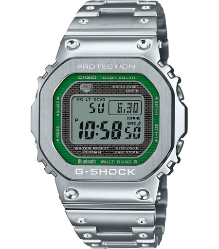 Diese Uhr ist nicht nur ein Zeitmesser, sondern ein Statement, das Ihr Selbstbewusstsein unterstreicht und Ihren individuellen Look vervollständigt. Lassen Sie sich von der zeitlosen Eleganz verführen, während Sie die modernste Technologie am Handgelenk tragen. Die Uhr vereint das Erbe der ersten G-SHOCK mit einem raffinierten Edelstahl-Design und einem einzigartigen grünen Akzent. Ihre stoßfeste Struktur wird durch unsichtbare Pufferkomponenten aus feinem Resin gewährleistet, die zwischen der robusten Metalllünette und dem Gehäuse platziert sind. Diese innovative High-Density-Montagetechnik sorgt dafür, dass die Uhr schlank und kompakt bleibt – ideal für den modernen Lifestyle. Ob beim Sport, im Büro oder in der Freizeit – diese Uhr ist Ihr treuer Begleiter. Gehäusegröße (L x B x H): 49.3 × 43.2 × 13 mm Gewicht: 167 g Gehäuse- und Lünettenmaterial: Edelstahl Band: Band aus Edelstahl Festes Band 3-fach gefalteter One-Touch-Verschluss Bauweise: Stoßfest Wasserbeständigkeit: Wasserdicht bis 20 bar Uhrzeiteinstellung: Funkgesteuerte Uhr; Multiband 6 Bluetooth: Stellt eine Verbindung zu einem Smartphone her und passt die Uhrzeit automatisch an Energieersorgung: Tough Solar (Solarbetrieb) Glas: Mineralglas Kompatible Bandgröße: 150 bis 205 mm Funktionen: Weltzeit, Stoppuhr, Timer, Kalender, Beleuchtung, Alarm, 12/24-Stundenformat, Wechsel zwischen Datums-/Monatsanzeige, Tagesanzeige (Wochentage in sechs Sprachen wählbar) Regelmäßige Zeiterfassung: Stunden, Minuten, Sekunden, 12 Stunden (pm), Monat, Datum, Tag ...