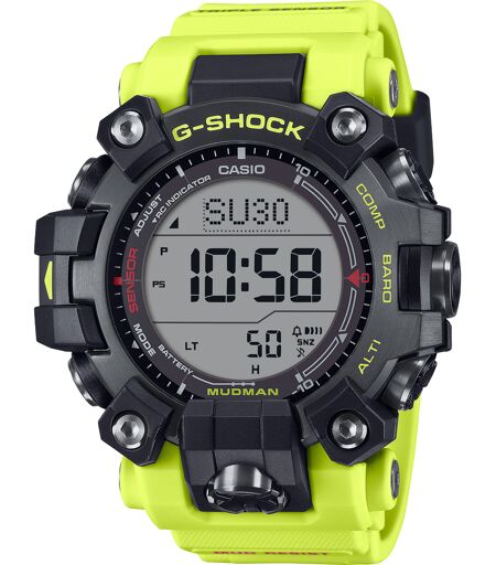 Die Casio G-SHOCK „Master of G“-Serie bietet Ihnen sofortige Vorteile, indem sie Ihnen die Sicherheit und Zuverlässigkeit gibt, die Sie in extremen Situationen benötigen. Die MUDMAN ist speziell für herausfordernde Bedingungen konzipiert und sorgt dafür, dass Sie auch unter Druck stets optimal ausgestattet sind. Ihr tiefschwarzes Design kombiniert mit einem leuchtend gelben Armband sorgt nicht nur für Robustheit, sondern auch für Sichtbarkeit – eine ideale Kombination für Profis in Rettungseinsätzen. Diese Uhr ist mehr als nur ein Zeitmesser; sie ist Ihr zuverlässiger Begleiter in kritischen Momenten. Die MUDMAN zeichnet sich durch ihre Stoßfestigkeit, Wasserbeständigkeit bis zu 200 Metern und spezielle Funktionen wie ein digitales Kompass- und Höhenmessgerät aus. Gehäusegröße (L x B x H): 56.7 × 52.7 × 14.8 mm Gewicht: 88 g Gehäuse- und Lünettenmaterial: Biobasiertes Karbon/Biobasiertes Harz/Edelstahl Band: Armband aus biobasiertem Resin Bauweise: Stoßfest Schmutzbeständig: Carbon Core Guard-Struktur Wasserbeständigkeit: Wasserdicht bis 20 bar Uhrzeiteinstellung: Funkgesteuerte Uhr; Multiband 6 Energieersorgung: Tough Solar (Solarbetrieb) Glas: Mineralglas Kompatible Bandgröße: 145 bis 215 mm Funktionen: Sonnen- und -untergangsanzeige, Timer, Beleuchtung, Kalender, Lichtfarbe, Weltzeit, Stoppuhr, Alarm, Stummschaltungsfunktion, Energiesparfunktion, 12/24-Stundenformat, Regelmäßige Zeiterfassung: Stunden, Minuten, Sekunden, 12 Stunden (pm), Monat, Datum, Tag ...