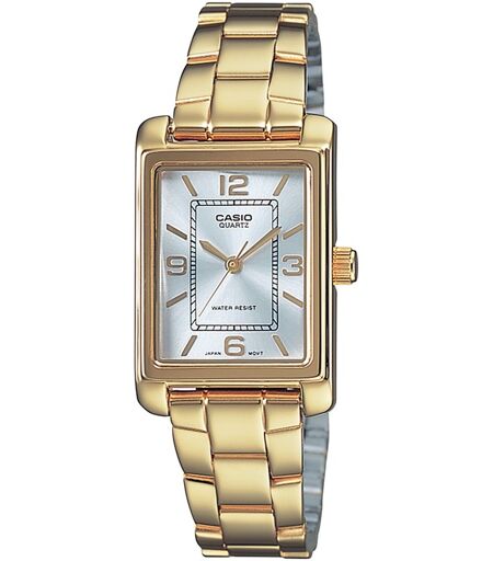Die Casio Uhr besticht durch ihre elegante Erscheinung und ihre hochwertigen Materialien. Das Gehäuse in den Maßen 32 × 21 × 7,4 mm ist in einem edlen Goldton gehalten und die Lünette ergänzt das Design perfekt. Das Armband aus Edelstahl mit einem 3-fach gefalteten One-Touch-Verschluss sorgt für einen angenehmen Tragekomfort. Die Uhr ist wasserabweisend und verfügt über eine Batterielaufzeit von ungefähr 3 Jahren. Das Mineralglas schützt das Zifferblatt zuverlässig. Mit einer Genauigkeit von ±20 Sekunden pro Monat und den regelmäßigen Zeiterfassungsfunktionen ist diese Uhr nicht nur ein stilvolles Accessoire, sondern auch ein zuverlässiger Begleiter im Alltag. ...