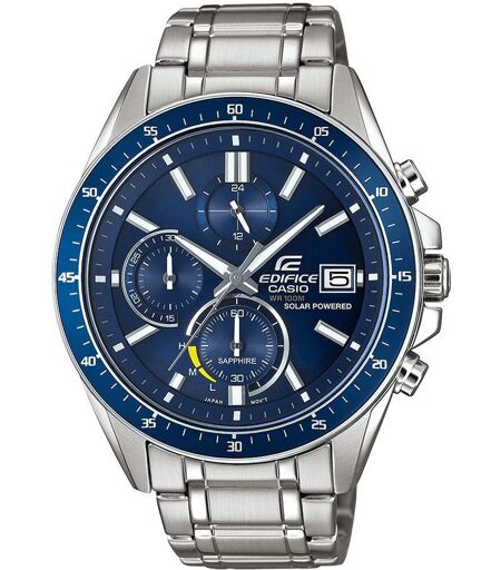 Gehäusematerial: Edelstahl Bandmaterial: Edelstahl Bandfarbe: Silberfarben Glasart: Saphirglas Zifferblattfarbe: Blau Uhrwerk: Quarz Verschluss: Sicherheitsschließe Wasserdichte: 10 Bar Abmessungen (H x B x T) : 52mm x 46,1mm x 11,8mm Funktionen: Solarbetrieb, Neo-Display, Datumsanzeige, Stoppfunktion, Ladekontrollanzeige ...