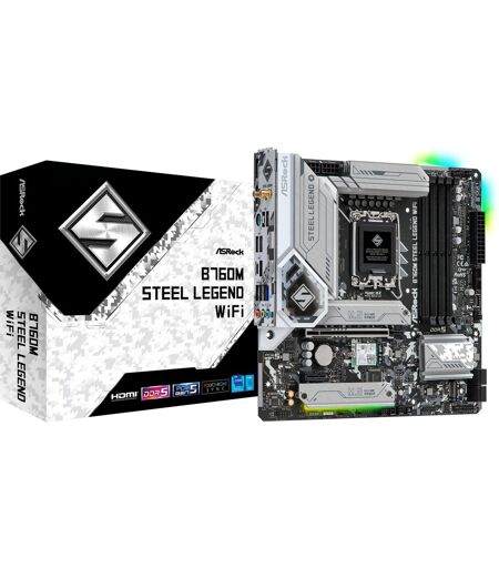 Das ASRock B760M Steel Legend WiFi Mainboard basiert auf dem Intel®-B760-Chipsatz und unterstützt Intel®-Prozessoren für den Sockel 1700. Es verfügt über vier DDR5-DIMM-Slots im Dual-Channel-Betrieb für bis zu 192 GB Arbeitsspeicher. Zur weiteren Ausstattung des ASRock B760M Steel Legend WiFi gehören ein PCIe-4.0-x16-Slot und ein PCIe-4.0-x1-Slot. Außerdem verfügt das ASRock B760M Steel Legend WiFi über 8-Kanal-Sound, eine 2,5 Gigabit-LAN-Schnittstelle, Wi-Fi6E, Bluetooth, vier SATA3-Anschlüsse, zwei M.2-Anschlüsse, und eine Reihe an USB-Schnittstellen. ...