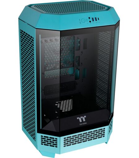 Der Tower 300 Turquoise behält die ikonischen Konturen seiner Vorgänger bei, mit einem vertikalen Gehäusedesign, jedoch in der Form eines achteckigen Prismas. Dadurch benötigt das Gehäuse weniger Stellfläche, ist flexibler und stört Ihren Gaming- und Arbeitsbereich weniger. Das Gehäuse bietet eine außergewöhnliche Kühlung, da er auf der rechten Seite einen bis zu 420 mm großen Kühler unterstützt, der die Temperatur im Gehäuse effektiv senkt und eine optimale Systemleistung aufrechterhält. Der Tower 300 Turquoise verfügt über drei 3 mm dicke Hartglasplatten auf der Vorderseite und zwei perforierte Platten auf jeder Seite. Alle sind ohne Werkzeug leicht abnehmbar. Der Tower 300 Turquoise verfügt über zwei 140-mm-PWM-Lüfter an der Oberseite, die für eine gute Kühlleistung sorgen. In Bezug auf die Speicherkompatibilität bietet der Tower maximale Unterstützung für insgesamt bis zu drei 2,5-Zoll-SSDs oder drei 3,5-Zoll-HDDs. Ein USB 3.2 (Gen 2) Typ-C und zwei USB 3.0-Anschlüsse befinden sich auf der Oberseite, um bei Bedarf direkten Zugriff zu ermöglichen. ...
