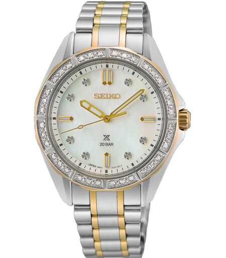Erleben Sie mit der Seiko Uhr höchste Präzision und zeitlose Eleganz – ein zuverlässiger Begleiter, der Ihren Alltag bereichert und Ihren Stil perfekt unterstreicht. Diese Uhr schenkt Ihnen nicht nur exakte Zeitmessung, sondern auch das Gefühl von Wertigkeit und Beständigkeit, das Sie verdient haben. Spüren Sie die Begeisterung, wenn Sie eine Uhr tragen, die nicht nur durch ihr edles Design überzeugt, sondern auch durch technische Raffinesse begeistert. Die Kombination aus hochwertigem Edelstahlgehäuse und funkelnden Diamanten auf dem Zifferblatt macht jeden Moment zu etwas Besonderem und verleiht Ihnen Selbstbewusstsein und Stil. Besonders hervorzuheben ist das präzise Kaliber 6N01, das mit einer Ganggenauigkeit von ±15 Sekunden pro Monat überzeugt. Das kratzfeste Saphirglas mit entspiegelter Innenseite sorgt für klare Sicht bei jedem Lichtverhältnis. LumiBrite auf Zeigern und Indizes garantiert beste Ablesbarkeit auch in dunklen Umgebungen. Zusätzlich punktet die Uhr mit einem robusten Sicherheitsfaltschließe sowie einem verschraubten Gehäuseboden, der für Wasserdichtigkeit bis 20 bar und magnetischen Widerstand sorgt – perfekt für aktive Träger. Kalibernummer: 6N01 Ganggenauigkeit: ±15 Sekunden pro Monat (Durchschnitt) Batterielebensdauer: ca. 3 Jahre Gehäusematerial: Edelstahl Gehäusegröße: Höhe 8,7 mm, Durchmesser 34,0 mm, Länge 40,8 mm Glas: Saphirglas mit entspiegler Beschichtung innen LumiBrite auf Zeigern und Indizes Sicherheitsfaltschließe Bandanstossbreite: 16 mm Wasserdichtigkeit: 20 bar Magnetischer Widerstand Zifferblatt mit Diamanten Lünette mit Diamanten Verschraubter Gehäuseboden ...