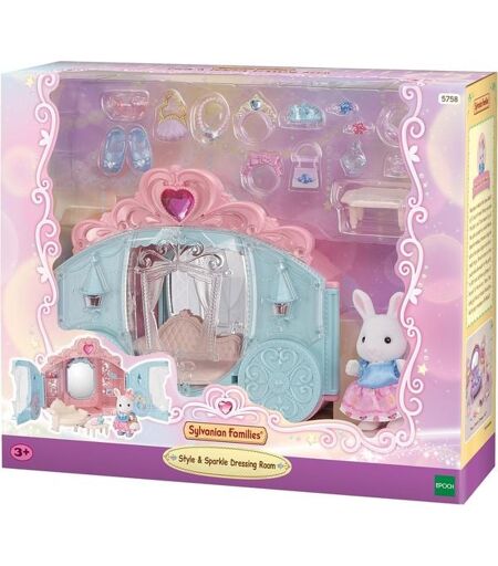Hereinspaziert ins elegante Ankleidezimmer von Sylvanian Families! Dieses zauberhafte Spielzeugset enthält eine wandelbare Kutsche, wunderschöne Accessoires und ein Schneehasen-Mädchen im Prinzessinnenkleid. Durch das Öffnen der Doppeltüren verwandelt sich die Kutsche in einen stilvollen Raum mit Regalen zur Aufbewahrung von Schmuck und Zubehör. Mit den zahlreichen Accessoires können Kinder verschiedene Looks kreieren und ihrer Kreativität freien Lauf lassen. Magischer Spielspaß für unterwegs: Ist die Spielzeit vorbei, werden alle Figuren, Möbel und Accessoires im Inneren des Zimmers verstaut und die Türen geschlossen. Dank des praktischen Griffs kann die Kutsche überallhin mitgenommen werden. Die Kleidung der Hasenfigur kann an- und ausgezogen werden. Arme, Beine und Kopf sind beweglich. Ein zauberhaftes Spielset für kreative Mädchen und Jungen ab 3 Jahren. ...