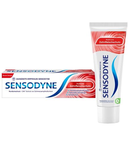 Anwendungsgebiet von Sensodyne Multicare Zahnfleischschutz ZahnpastaSensodyne MultiCare Zahnfleischschutz Zahnpasta tägliche Zahnpasta mit Fluorid, bei schmerzempfindlichen Zähnen, 75mlViele Menschen leiden unter empfindlichen Zähnen. Ursache hierfür kann der Abbau von Zahnschmelz oder ein Rückgang des Zahnfleisches sein. In diesen Fällen liegt das empfindliche Dentin frei, was zu Schmerzen führen kann – beispielsweise beim Genuss von heißen oder kalten Speisen und Getränken.Durch die tägliche Verwendung einer speziell entwickelten Zahnpasta lässt sich die Schmerzempfindlichkeit häufig lindern. Sensodyne MultiCare Zahnfleischschutz ist für die tägliche Anwendung konzipiert und bietet klinisch bestätigten 24-Stunden-Schutz* vor schmerzempfindlichen Zähnen. Bei regelmäßigem Putzen hilft die Zahnpasta zudem, Zahnfleischproblemen vorzubeugen.Der enthaltene Wirkstoff Kaliumnitrat legt sich schützend um den Zahnnerv, beruhigt ihn und unterstützt so den Schutz vor Schmerzempfindlichkeit. Zusätzlich enthält die Formel einen antibakteriell wirkenden Inhaltsstoff, der Bakterien im Mund reduziert und so zu gesundem Zahnfleisch beiträgt.Zahnärzte empfehlen Sensodyne für die tägliche Zahnpflege empfindlicher Zähne.Recyclingfähige Tube, recycelter und recyclingfähiger Karton.*Bei zweimal täglichem Zähneputzen nach 2-4 Wochen AnwendungWirkstoffe / Inhaltsstoffe / ZutatenSensodyne Multicare Zahnfleischschutz Zahnpasta enthält: Aqua, Sorbitol, Hydrated Silicea, Glycerin, Potassium Nitrate, Aroma, Zinc Citrate, Xanthan Gum, Cocamidopropyl Betaine, Sodium Methyl Cocoyl Taurate, Sodium Saccharin, Sodium Fluoride, Sodium Hydroxide, Limonene, CI 19140, CI 42090. Enthält: Natriumfluorid (1450 ppm Fluorid).GegenanzeigenBei bekannter Überempfindlichkeit gegenüber einem der oben genannten Inhaltsstoffe sollte dieses Produkt nicht angewendet werden. DosierungAnwendungsempfehlung von Sensodyne Multicare Zahnfleischschutz Zahnpas ...