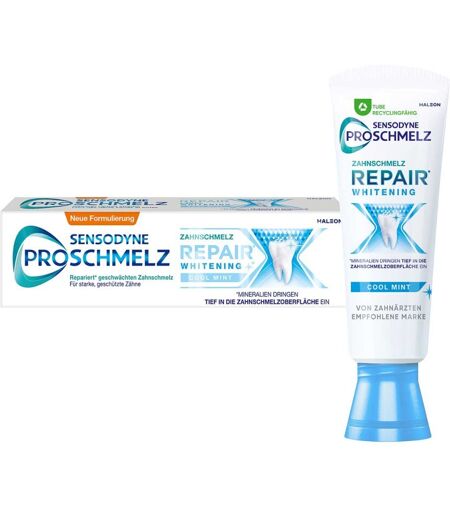 Anwendungsgebiet von Sensodyne Proschmelz Repair Whitening ZahnpastaSensodyne ProSchmelz Repair Whitening Zahncreme, 75ml, tägliche Zahnpasta mit Fluorid für weiße Zähne, repariert nachweislich durch Säuren geschwächten Zahnschmelz & entfernt VerfärbungenDer Zahnschmelz bildet die äußere Schutzschicht Ihrer Zähne und ist entscheidend für deren Gesundheit. Säuren, die in Lebensmitteln und Getränken enthalten sind, können diesen natürlichen Schutz jedoch schwächen und so einen Zahnschmelzabbau begünstigen. Mit der Zeit werden die Zähne dadurch dünner, wirken gelblicher und reagieren empfindlicher auf Reize.Durch die regelmäßige Verwendung einer speziell entwickelten Zahnpasta können Sie aktiv dazu beitragen, Ihre Zähne vor diesen Folgen zu schützen. Die Sensodyne Proschmelz Repair Whitening Zahnpasta unterstützt die Einlagerung von Mineralien tief in die Zahnschmelzoberfläche. So wird geschwächter Zahnschmelz regeneriert und gestärkt – für ein besser geschütztes Gebiss.Bei zweimal täglichem Putzen hilft Ihnen diese Zahnpasta nicht nur, den Zahnschmelz zu reparieren und Mineralien zuzuführen, sondern auch, die Folgen von säurebedingtem Zahnschmelzabbau zu verhindern. Darüber hinaus schützt sie vor Karies, entfernt sanft Verfärbungen und sorgt so für natürlich weißere Zähne.Da die Formel speziell für empfindliche Zähne entwickelt wurde, können Sie wieder unbeschwert heiße und kalte Speisen und Getränke genießen – und sich über gesunde, weniger empfindliche Zähne freuen.Befolgen Sie stets die Anwendungshinweise: 2x bis max. 3x pro Tag Zähneputzen, dann ausspucken, Schlucken vermeiden.Wirkstoffe / Inhaltsstoffe / ZutatenZusammensetzung von Sensodyne Proschmelz Repair Whitening Zahnpasta:Aqua, Sorbitol, Hydrated Silica, Glycerin, Potassium Nitrate,PEG-6, Sodium Lactate, Aroma, Cocamidopropyl Betaine, Xanthan Gum,Sodium Saccharin, Sodium Fluoride, PVM/MA Copolymer, Sodium Hydroxide,Limonene, CI 74160, ...