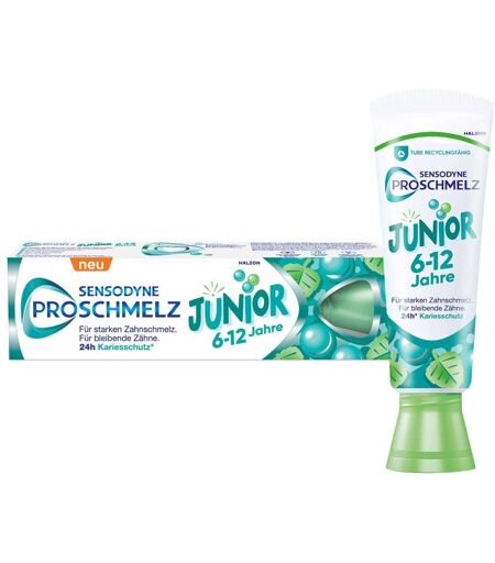 Anwendungsgebiet von Sensodyne Proschmelz Junior 6-12 Jahre ZahnpastaSensodyne ProSchmelz Junior Zahncreme Kinder für 6-12 Jahre, für die bleibenden Zähne, für starken Zahnschmelz und zum Schutz vor Zuckersäuren, 75mlWussten Sie, dass der Zahnschmelz neuer, bleibender Zähne bis zu drei Jahre benötigt, um vollständig auszuhärten? In dieser Zeit sind die Zähne Ihres Kindes besonders anfällig für säurebedingten Zahnschmelzabbau. Daher ist es entscheidend, sie mit einer Zahnpasta zu pflegen, die den Zahnschmelz schützt, stärkt und remineralisiert.Die Sensodyne Proschmelz Junior 6-12 Jahre Zahnpasta wurde in Zusammenarbeit mit Zahnärzten speziell für Kinder zwischen 6 und 12 Jahren entwickelt. Sie hilft, den empfindlichen Zahnschmelz zu schützen und bietet bei regelmäßigem, zweimal täglichem Putzen einen 24-Stunden-Kariesschutz.*Dank eines altersgerechten Fluoridgehalts von 1.450 ppm und 100 % natürlichen Aromen trägt sie dazu bei, die neuen bleibenden Zähne stark und gesund zu halten. Ihre sanfte, gering abrasive Formel reinigt besonders schonend, während der beliebte Bubble-Mint-Geschmack das tägliche Zähneputzen angenehmer macht.Darüber hinaus ist die ProSchmelz Junior Zahnpasta vegan** und somit frei von tierischen Inhaltsstoffen. Tube und Faltschachtel sind recyclingfähig und leisten so einen Beitrag zum Umweltschutz.* Bei zweimal täglichem Zähneputzen und zahngesunder Ernährung** Enthält keine tierischen oder aus Tieren gewonnenen InhaltsstoffeWirkstoffe / Inhaltsstoffe / ZutatenZusammensetzung von Sensodyne Proschmelz Junior 6-12 Jahre Zahnpasta:Aqua, Sorbitol, Hydrated Silica, Glycerin, PEG-6,Cocamidopropyl Betaine, Xanthan Gum, Aroma, Sodium Saccharin,Sodium Fluoride, Limonene, Sodium Hydroxide, CI 42090.Enthält: Natriumfluorid / Contient: Sodium fluoride (1450 ppm F-).GegenanzeigenBei bekannter Überempfindlichkeit gegen einen der Inhaltsstoffe sollte dieses Produkt nicht eingenommen werden.DosierungAnwendungsempfehl ...