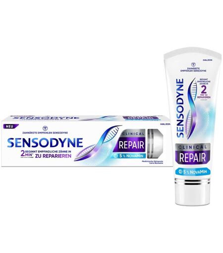 Anwendungsgebiet von Sensodyne Clinical Repair ZahnpastaSensodyne Clinical Repair Zahnpasta für empfindliche Zähne mit 5 % NovaMin, für langanhaltende Linderung, 75mlDie Sensodyne Clinical Repair Zahncreme mit 5 % NovaMin beginnt bereits nach nur 2 Minuten* damit, Ihre empfindlichen Zähne zu reparieren. Dank der innovativen NovaMin-Technologie legt sich eine mineralische Schutzschicht über die empfindlichen Bereiche Ihrer Zähne, die zu 96 % aus einem Material besteht, das dem natürlichen Zahnschmelz sehr ähnlich ist. Mit jeder Anwendung wird diese Schutzbarriere weiter gestärkt.Der Sensodyne Zahnpasta bildet wissenschaftlich nachgewiesen eine mineralisierte Schutzschicht über den freiliegenden Dentinbereichen der Zähne und repariert so das Schutzschild, das empfindliche Zähne verloren haben. *für klinisch bestätigte Linderung nach 14 Tagen - bei 2x täglicher AnwendungWirkstoffe / Inhaltsstoffe / ZutatenZusammensetzung von Sensodyne Clinical Repair Zahnpasta: Glycerin, PEG-8, Hydrated Silica, Calcium Sodium Phosphosilicate (NovaMin 5% w/w), Perlite, Aroma, CocamidopropylBetaine, Sodium Methyl Cocoyl Taurate, Carbomer, Silica, Sodium Fluoride, Sodium Saccharin, CI 74160, CI 74260.Enthält/ Contient/ Contiene: Natriumfluorid/ Fluorure de sodium/ Fluoruro di Sodio 0.315% w/w (1450 ppm F-).GegenanzeigenBei bekannter Überempfindlichkeit gegen einen der Inhaltsstoffe sollte dieses Produkt nicht eingenommen werden.DosierungAnwendungsempfehlung von Sensodyne Clinical Repair Zahnpasta:Bitte halten Sie sich stets an die Anwendungsempfehlungen: Putzen Sie Ihre Zähne zwei- bis höchstens dreimal täglich und spucken Sie die Zahnpasta anschließend aus. Achten Sie darauf, sie nicht zu schlucken.HinweiseBefolgen Sie stets die Anwendungshinweise. 2x bis max. 3x pro Tag Zähneputzen, dann ausspucken. Schlucken vermeiden. Empfindliche Zähne können auf ein tieferliegendes Problem hinweisen. Kontaktieren Sie bei anhaltenden Symptomen Ihren Zahnarzt. Außerha ...