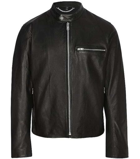 Herren Jacke aus glattem Leder Stehkragen mit Druckknopfverschluss Langarm Schließt mit Reißverschluss Eine Brusttasche mit Reißverschluss Seitliche Eingriffstaschen mit Reißverschluss Unifarben Gerade Passform Farbbezeichnung: Black Material: Leder ...