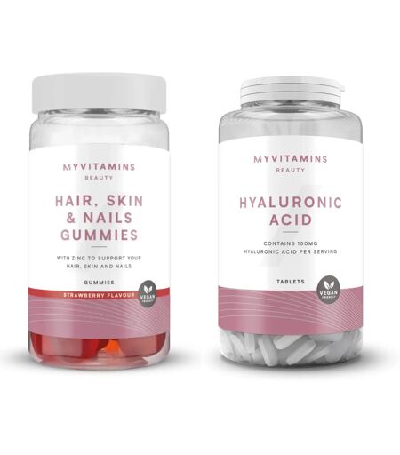 Elevate your daily beauty routine with the Myvitamins Vegan Beauty Bundle. Suitable for vegans and vegetarians, the duo features hyaluronic acid tablets and strawberry-flavoured gummies for healthy-looking hair, skin and nails.Set Contents:Myvitamins Hyaluronic Acid Tablets, 30 tabletsA pure source of a moisture-retaining molecule found in our skin, the hyaluronic acid tablets are designed to support the body's natural levels. Hyaluronic acid is found naturally in our skin, where it stores 1000x its own weight in water. . Each tablet contains 150mg of hyaluronic acid for a quick, convenient solution.Myvitamins Vegan Hair Skin Nails Gummies Strawberry Flavour, 60 GummiesThese strawberry-flavoured gummies are a nourishing blend of 8 nutrients, including zinc to contribute to healthy hair, skin and nails (1), vitamin C to support collagen formation (2), and vitamin A to contribute to the maintenance of normal skin (3). 1. Zinc contributes to the maintenance of normal hair, skin and nails.2. Vitamin C contributes to normal collagen formation for the normal function of skin.3. Vitamin A contributes to the maintenance of normal skin. ...