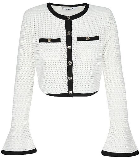 Damen Strickjacke mit Pailletten-Besatz Rundhalsausschnitt Langarm Trompetenärmel Schließt mit Knopfleiste Zwei aufgesetzte Eingriffstaschen mit Knopfverschluss Kontraststreifen Cropped Fit Schmale Passform Farbbezeichnung: White Material: 57% Viskose 25% Polyester 18% Polyamid ...