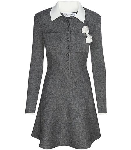 Ein neuer Blick auf den Preppy-Stil: Dieses graue Strickkleid überzeugt mit kontrastierendem Kragen und Ärmelabschlüssen sowie einem gehäkelten Blumenmotiv als verspieltes Detail. Der ausgestellte Mini-Saum lässt sich perfekt mit eleganten Flats kombinieren – ideal für Tage vom Büro bis zum Dinner. Details: Elegantes Damen Minikleid aus hochwertigem Wollmix Langarm Hemdblusenkragen in Kontrastfarbe Elastisches Material Knopfleiste vorne Abnehmbare Blumen-Brosche Abnehmbare Schulterpolster Unifarben Schmale Passform Farbbezeichnung: Grey Material: 47 % Baumwolle, 45 % Wolle, 5 % Polyamid, 2 % Kaschmir, 1 % Elasthan Kragen: 70 % Viskose, 20 % Polyester, 9 % Polyamid, 1 % Elasthan (ohne Besatz) ...