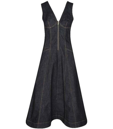 Damen Midikleid aus Denim V-Ausschnitt mit Reißverschluss Ämellos Rückenausschnitt Tailliert geschnitten Zwei Eingrifftaschen vorne Ausgestellte Passform Midilänge Länge: Ca: 123 cm Farbbezeichnung: Blue Material: 94% Baumwolle 5% Polyester 1% Elastan ...