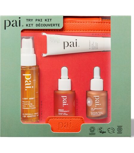 The perfect introduction to Pai Skincare, the Try Pai Kit features four best-selling formulas in travel-friendly sizes that help to purify, nourish and visibly brighten the complexion. Vegan. Set Contents: Light Work Rosehip Cleansing Oil 28ml Experience a skin detox with this non-stripping cleansing oil. The formula gently removes stubborn makeup, impurities and SPF, and visibly boosts the skin’s radiance with rosehip fruit extract. The Anthemis Moisturiser 10ml A nourishing face cream with soothing properties, designed to hydrate the skin without feeling sticky or heavy. Thanks to chamomile and rosehip oil, the look of redness is diminished. The Impossible Glow Bronzing Drops 10ml Blurring the lines between makeup and skincare, this buildable formula adds a warm, sun-kissed glow to the complexion. The multi-purpose drops also help to moisturise with hyaluronic acid and sea kelp. Rosehip Bioregenerate Facial Oil 10ml This nurturing face oil addresses a variety of skin concerns in one step. Packed full of omegas, the concentrated blend works to protect, soothe and noticeably clarify the skin, while softening the appearance of fine lines and toning. ...