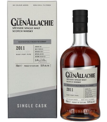 Der The GlenAllachie 12 Years Old Ruby Port Pipe 2011 55,9% Vol. 0,7 l + GB ist eine limitierte Einzelfassabfüllung der renommierten Speyside-Destillerie GlenAllachie, die unter der Leitung von Master Distiller Billy Walker für ihre innovativen Fassreifungen und intensiven Single Malts bekannt ist. Destilliert am 15.08.2011 und im Juni 2024 abgefüllt, durfte dieser Whisky volle 12 Jahre in einem ausgewählten Ruby Port Pipe reifen. Durch diese lange Reifung erhält er sein kraftvolles und fruchtbetontes Aromaprofil, das ihn von klassischen Sherry- und Bourbonfass-Reifungen deutlich abhebt. Mit kräftigen 55,9% Vol. kommt er in natürlicher Fassstärke ins Glas, selbstverständlich ohne Kühlfiltration und ohne Farbstoff, um den authentischen Charakter des Fasses zu bewahren. Diese streng limitierte Edition umfasst lediglich 765 Flaschen, was sie zu einer begehrten Rarität für Sammler und Kenner macht. Die 0,7 l Flasche wird in einer edlen Geschenkbox präsentiert und verkörpert eindrucksvoll die Handwerkskunst und das Fassmanagement von GlenAllachie. arbe: Tiefes Rubinrot mit mahagonifarbenen Reflexen. Nase: Intensiv fruchtig, mit Noten von Kirschen, Himbeeren, dunkler Schokolade, Honig und Eichenwürze. Geschmack: Vollmundig und komplex, mit einer Balance aus roten Beeren, süßem Malz, Karamell, Gewürzen und feiner Eiche. Abgang: Lang anhaltend, kräftig und fruchtig-würzig, mit anhaltenden Portnoten und eleganter Wärme. Der GlenAllachie 12 Years Old Ruby Port Pipe entfaltet seinen Charakter am besten pur im Nosing-Glas, gerne mit einem Tropfen Wasser, um die komplexen Fruchtnoten noch stärker hervorzuheben. Er passt hervorragend zu Desserts wie Schokoladenfondant, Fruchtkuchen oder Crème Brûlée. Ebenso harmoniert er mit kräftigen Käsesorten wie Stilton oder Manchego. Für besondere Genussmomente bietet er sich zudem als perfekter Begleiter zu einer edlen Zigarre an, die seine intensive Fruchtigkeit und Würze elegant unterstreicht. ...