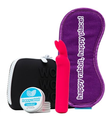 clitoral pleasure kit von happyrabbit beinhaltet 1 x Minivibrator, 1 x Menthol-Balsam, 1 x Augenmaske und 1 x Toybag. Der Minivibrator mit flexiblen Öhrchen schenkt mit 12 Vibrationsmodi abwechslungsreichen Verwöhn-Spaß im und am Körper. Auch in der Badewanne oder unter der Dusche, denn der Minivibrator ist wasserdicht! Rundum mit Soft Touch Textur überzogen, sorgt er beim Spielen und Verwöhnen für ein sehr angenehmes Hautgefühl. Mit Tastensperre. Gesamtlänge 11,5 cm, Ø 2,2 cm – 2,7 cm. Wiederaufladbar – inkl. USB-Ladekabel. Das Menthol-Balsam wird z. B. auf Klitoris, Brustwarzen oder andere empfindliche äußere Zonen aufgetragen und vermittelt erfrischend prickelnde Gefühle, die die Erregung stark steigern können. 7 g. Das Tragen der blickdichten Augenmaske schärft die Sinne und lässt Stimulationen intensiver empfinden. 19,5 cm lang. Und im Toybag lassen sich alle Teile des Sets diskret und staubsicher verwahren. 26 cm lang. Silikon, ABS, Baumwolle, Metall. ...