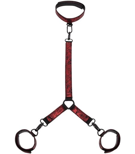 Die Hals- und Handfessel Sweet Anticipation Collar and Wrist Cuffs von Fifty Shades of Grey sorgt für die wirkungsvolle Fixierung der Hände vor oder hinter dem Körper. An dem Mittelsteg werden die Hals- und die Handfesseln mit ihren D-Ringen in die Clipkarabiner eingehakt. Die bequem gepolsterten Manschetten sowie der Mittelsteg sind beidseitig tragbar: Eine Seite in schwarzer Lederoptik, andere Seite mit Satin im schwarz/roten Rosendesign. Die Fesseln sind mit Klettverschlüssen schnell angelegt und im Umfang passend verstellbar. Inklusive Aufbewahrungsbeutel. Halsfessel 2,5 cm breit, 45 cm lang Handfessel je 2,5 cm breit, 26,5 cm lang Mittelsteg 24,5 cm lang, Fesselstege je 7,5 cm lang, alle Stege 2,5 cm breit. PU, Metall, Polyamid, Polyester. ...