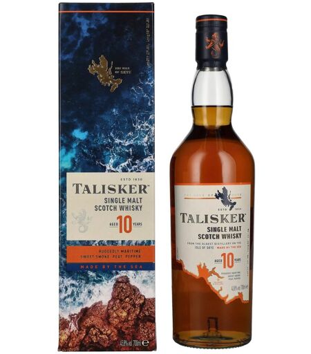 Der Talisker 10 Years Old Single Malt Whisky ist ein legendärer maritimer Scotch Whisky von der schottischen Isle of Skye. Als älteste und einzige Destillerie der Insel verkörpert Talisker den wilden, rauen Charakter seiner Heimat perfekt. Bekannt für seine kraftvollen Rauch- und Meeresaromen, gepaart mit einer würzigen Süße, gehört dieser 10 Jahre gereifte Single Malt zu den Klassikern unter den schottischen Whiskys. Hergestellt aus peated malted barley, wird der Whisky in traditionellen Kupferbrennblasen destilliert und anschließend für ein Jahrzehnt in amerikanischen Eichenfässern gereift. Das Ergebnis ist ein perfekt ausbalancierter Whisky mit rauchigen, salzigen und würzigen Noten, die seine Herkunft direkt widerspiegeln. Mit 45,8% Vol. besitzt er einen kräftigen Charakter, bleibt aber dennoch angenehm weich im Mundgefühl. Ein kraftvoller, markanter Insel-Whisky, der mit seiner salzigen Frische, würzigem Rauch und unverwechselbaren Pfeffernote ein echtes Highlight für Liebhaber intensiver Single Malts ist! Farbe: Strahlendes Gold. Nase: Kräftiger Torfrauch, maritime Salznoten, frische Zitrusfrüchte, schwarzer Pfeffer und eine dezente Honigsüße. Geschmack: Vollmundig und intensiv, mit süßem Malz, würzigem Rauch, Meersalz, Pfeffer, Honig und einem Hauch von grünen Äpfeln. Abgang: Langanhaltend, trocken und wärmend, mit anhaltendem Rauch, Salz und einem würzigen Pfefferkick. Der Talisker 10 Years Old ist ein Whisky, der sich ideal pur oder mit ein paar Tropfen Wasser genießen lässt, um seine Aromen weiter zu entfalten. Seine rauchigen und maritimen Noten machen ihn zum perfekten Begleiter für gegrillten Fisch, geräucherten Schinken oder würzigen Blauschimmelkäse. Auch in Kombination mit dunkler Schokolade mit Meersalz oder herzhaften BBQ-Gerichten entfaltet er seine besondere Tiefe. ...