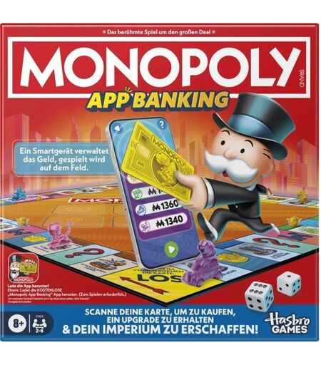 """Die App verwaltet das Geld, gespielt wird auf dem Feld. Monopoly App Banking ist das erste App-unterstützte Monopoly-Spiel mit einer einfachen Geldverwaltung, Minispielen und mehr! Während die Spieler das klassische Monopoly auf dem Spielplan genießen, übernimmt die App die Funktion der Bank und des Bankhalters. Kein Bargeld. Kein Zählen! Um zu beginnen, wird die ''Monopoly App Banking App heruntergeladen (zum kostenlosen Download – es können Datentarife und In-App-Käufe anfallen) und ein Smartgerät auf dem beiliegenden Ständer platziert. (Gerät nicht enthalten.) Jeder Spieler sucht sich eine Bankkarte und die dazugehörige Spielfigur aus und zieht dann über einen Spielplan voller fantastischer Besitztümer. Besitzrechtkarten scannen und kaufen, Auktionen starten und Miete kassieren # all das funktioniert mit der App. Für noch mehr Spaß stehen sogar Minispiele zur Verfügung! Es bietet im Vergleich zum klassischen Monopoly einen schnelleren Spielverlauf und eignet sich prima für zwischendurch oder einen Spieleabend mit der Familie. App-Spiele und Familienspiele sind tolle Geschenke für Kinder ab 8 Jahren, die auch ''Monopoly Banking und andere Monopoly-Spiele mögen. Die Titel Hasbro und Monopoly sowie die dazugehörigen Logos, die Gestaltung des Spielplans, die vier Eckfelder, Name und Figur des Mr. Monopoly sowie alle Elemente des Spielplans und des Spielzubehörs sind eingetragene Marken von Hasbro, Inc. für das Monopoly-Gesellschaftsspiel inklusive Spielausstattung.""" ...