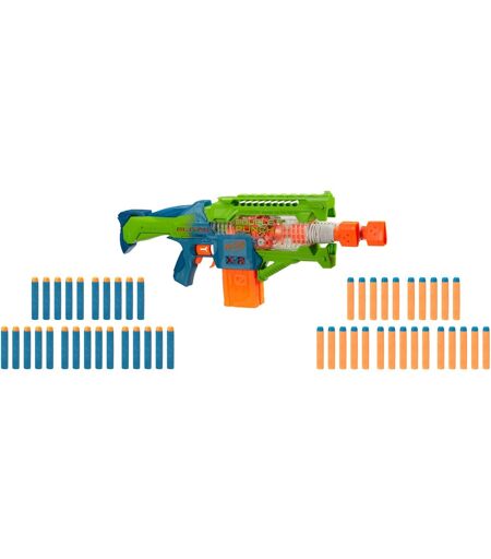 Mit diesem motorisierten Blaster ist zweifache Action angesagt. Der Dartblaster Nerf Elite 2.0 Double Punch hat zwei Läufe, die beim Abfeuern der Darts schnell vor- und zurückfahren. Er kommt mit zwei Clip-Magazinen, die jeweils zehn Darts fassen, so dass insgesamt 20 Darts nacheinander abgefeuert werden können. Es werden insgesamt 50 Darts mitgeliefert: So stehen mehr als genug Darts bereit, um beide Clip-Magazine zweimal zu laden und nebenbei noch Ersatzdarts zu haben. ...