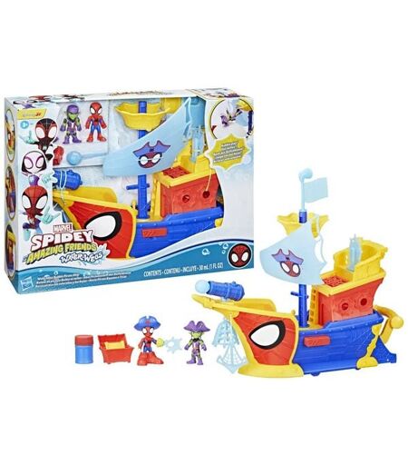 """Mit dem Water-Webs Ahoi Piratenschiff können Kinder in piratenstarke Action und Abenteuer im Stil von ''Spidey und seine Super-Freunde eintauchen. Das Spielset wartet mit einer Seifenblasen-Falle, einem Drehmast mit Ausguck, einer einziehbaren Planke und mehr auf! Enthält bewegliche und 7,6 cm große Spidey und Grüner Kobold Figuren mit coolen, abnehmbaren Accessoires wie 2 Piratenhüten und 1 Paar Piratenstiefeln. Schatztruhe, Landkarte, Flasche mit Seifenblasenlösung und mehr sorgen für noch mehr Abenteuer. Um das Ahoi Piratenschiff zu reinigen, wird es einfach nach jeder Verwendung abgespült und gründlich getrocknet (siehe Anleitung für mehr Informationen). Es gibt noch mehr Marvel Action-Figuren und Fahrzeuge, um sich eine fantastische Spielzeugkollektion aufzubauen. Spidey Spielzeuge wie Figuren und Spielsets sind auch tolle Geschenke für Kinder ab 3 Jahren. Verfügbare Charaktere umfassen Miles ''Spin Morales, Ghost-Spider, Captain America: Steve Rogers, Black Panther und Iron Man. (Jeweils separat erhältlich. Je nach Verfügbarkeit.) Copyright MARVEL. Alle Marken und eingetragenen Marken sind Eigentum ihrer jeweiligen Inhaber. HASBRO und alle damit verbundenen Marken und Logos sind Marken von Hasbro, Inc.""" ...