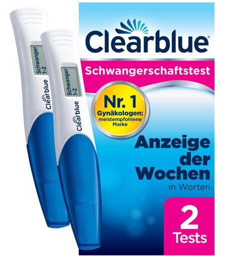 Clearblue Schwangerschaftstest mit Wochenbestimmung Der Clearblue Digital Schwangerschaftsfrühtest mit Wochenbestimmung ist der bisher einzige Test, der bei der Bestimmung der Schwangerschaftswoche genauso zuverlässig ist wie eine Ultraschalluntersuchung.* Sein intelligenter Dual-Sensor zeigt Ihnen auf dem digitalen Display in Worten an, ob Sie schwanger sind oder nicht und seit wann Sie schwanger sind – die Wochen seit der Empfängnis werden als 1–2, 2–3 oder 3+ auf dem Display angezeigt. Mit diesem Schwangerschaftstestkit zur Heimanwendung können Sie 5 Tage vor dem Ausbleiben der Periode testen, ob Sie schwanger sind (d. h. 4 Tage vor Fälligkeit Ihrer Periode)**. 65 % der Ergebnisse Schwanger“ können 5 Tage vor dem Ausbleiben der Periode erkannt werden. Wenn Sie vor Fälligkeit Ihrer Periode testen möchten, verwenden Sie für eine genaue Wochenbestimmung Ihren ersten Morgenurin. * Ergebnis in Wochen stimmte zu 97 % mit späterer Bestimmung des Empfängnisdatums durch Ultraschall überein. Basierend auf Studien mit 187 Frauen und auf einem Vergleich der Ergebnisse mit der Wochenbestimmung durch Ultraschall. **98 % der Ergebnisse Schwanger“ wurden am Tag vor Fälligkeit der Periode, 97 % 2 Tage vor Fälligkeit der Periode, 90 % 3 Tage zuvor und 65 % 4 Tage vor Fälligkeit der Periode erkannt. Vorteile: Multipack mit hervorragendem Preis-Leistungs-Verhältnis für mehr Sicherheit: X Schwangerschaftstests für absolute Sicherheit Anzeige der Schwangerschaft und der Wochenanzahl seit der Empfängnis: 1–2, 2–3 oder mehr als 3 Wochen So präzise wie ein Ultraschall bei der Bestimmung der Schwangerschaftswoche* Früher testen: Ergebnisse 5 Tage vor Ausbleiben der Periode (4 Tage vor dem Fälligkeitstag Ihrer Periode)** Keine Marke ist genauer: Clearblue ist über 99 % zuverlässig bei der Erkennung einer Schwangerschaft ab dem Fälligkeitstag der Periode Eindeutige digitale Ergebnisse in Worten in 3 Minuten Nr. 1 – die von Gynäkologen meistempfohlene Marke in Deutschland Anwendung: Halten Sie das Teststäbchen mit der saugfähigen Spitze nach unten genau 5 Sekunden lang in Ihren Urinstrahl. Achten Sie darauf, dass nicht das ganze Teststäbchen des digitalen Schwangerschaftstests nass wird. Sie können auch eine Urinprobe in einem sauberen, trockenen Behälter auffangen. Halten Sie die Testspitze nach unten zeigend für genau 20 Sekunden in die Urinprobe. Wenn Sie möchten, können Sie die Kappe wieder aufsetzen und das Teststäbchen auf eine flache Oberfläche legen. Halten Sie die Testspitze nach unten oder legen Sie das Teststäbchen des digitalen Schwangerschaftstests auf eine flache Oberfläche, während Sie auf das Ergebnis warten. Wichtig! Halten Sie das Teststäbchen während der Durchführung niemals mit der saugfähigen Testspitze nach oben. Nach der Durchführung des Clearblue Schwangerschaftstests mit Wochenbestimmung zeigt das blinkende Symbol „Warten“ an, dass der Test läuft. Wenn das Symbol „Warten aufhört zu blinken, wird das Ergebnis angezeigt. Ablesen... ...