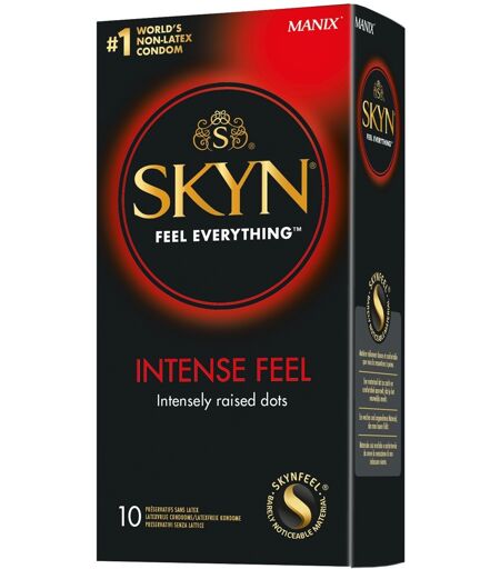 Hauchdünne Transparenz für noch mehr Gefühl: genoppte, Kondome Manix SKYN Intense Feel mit Feuchtbeschichtung auf Silikonbasis. Vegan. Das Polyisopren-Material der Kondome wird Skynfeel genannt und ist weicher und elastischer als Latex, dabei aber genauso stabil und kommt ohne den klassischen Latexgeruch aus. Es ist somit ideal für Latexallergiker geeignet. ...
