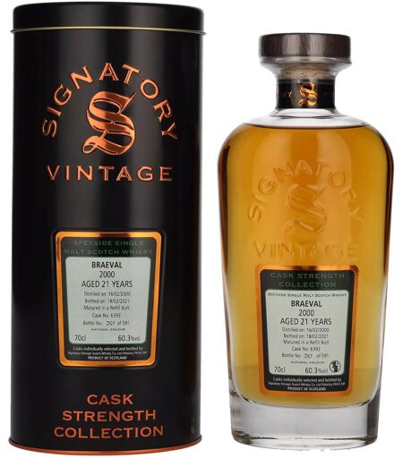 Signatory Vintage BRAEVAL 21 Years Old Cask Strength 2000 60,3% Vol. 0,7l in Tinbox