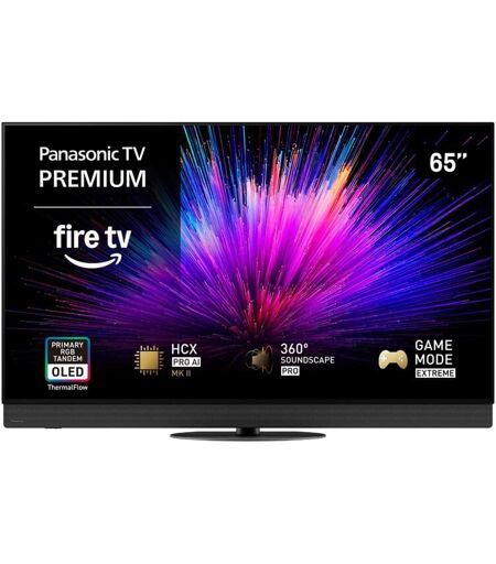 Primary RGB Tandem OLED Panel mit ThermalFlow und integriertem Premium Fire TV: Die Z95B-Serie von Panasonic beeindruckt mit revolutionärer OLED-Technologie kombiniert mit den smarten Eigenschaften von Fire TV. Das Primary RGB Tandem OLED Panel mit aerodynamischen ThermalFlow-Wärmemanagement steht mit einer deutlich gesteigerten Spitzenhelligkeit und bestechenden Kontrastwerten für eine Premium-Bildqualität der nächsten Generation. Für immersive Klangerlebnisse mit Dolby Atmos sorgen mehrere nach oben, seitlich und vorne abstrahlende Lautsprecher des 360° Soundscape Pro Soundsystems. Das Entertainment-Universum von Fire TV, der Game Mode Extreme mit zahlreichen Next-Gen-Gaming-Features und Multi HDR Ultimate bieten Welten unendlicher Unterhaltung und visueller Brillanz für ein täglich neues TV-Erlebnis. Bild-Eigenschaften164 cm Bilddiagonale; 65 Zoll Bilddiagonale; 3840 Pixel, horizont.; 2160 Pixel, vertikal; Dolby Vision IQ; HDR 10+ Adaptive; 120 Hz Technik; automatische Raumlichtanpassung; Multi-PiP; Elektronik-EigenschaftenUltra HD; variable Bildwiederholfrequenz (VRR); Auto Low Latency Mode (ALLM); G-Sync; FreeSync Premium; HDCP 2.3 kompatibel; Bildschirmanzeigen (OSD); mehrsprachiges Menü; elek. menügest. TV-Programmführung (EPG); Datenverbindung zwischen Video und TV; eARC (Enhanced Audio Return Channel); Idealwert-Funktion Bild/Ton; Smart TV AusstattungAmazon Prime Video; Netflix; Amazon Alexa kompatibel; HbbTV; Online Apps erhältlich; Online Videodienste abrufbar; USB-Aufnahmefunktion; Medienwiedergabe über USB; steuerbar über Smartphone/Tablet; TV-Signal-Streaming; Sprachsteuerung; Smartp.-/Tabl. Inhalte kabellos streamen; AirPlay fähig; Dolby-ProLogic-DekoderDolby Atmos; Ton-EigenschaftenBreitband-Lautsprecher; integrierter Bass/Subwoofer; Musikleistung gesamt: 170 W; EmpfangseigenschaftenUHDTV-Empfang; SAT>IP; DVB-T2 Twin-Tuner; DVB-C Twin-Tuner; DVB-S2 Twin-Tuner; analoger Kabelempfang; AnschlüsseKopfhörer-Anschluss; Digital-Optisch (OUT), Audio; Common-Interface (CI+); 1 x Common-Interface (CI+); USB-Schnittstellen: 2; USB 3.0 Schnittstellen: 1; HDMI-Schnittstelle 2.1; 4 x HDMI-Schnittstelle (IN); Bluetooth-Schnittstelle; WLAN integriert; Ethernet LAN; LeistungsaufnahmeAngabe gem. EU-Verordnung 2019/2013; Energieeffizienzklasse G; Spektrum [A bis G]; Energieeffizienzklasse HDR-Wiedergabe G; min. Netzspannung: 220 V; max. Netzspannung: 240 V; Leistungsaufnahme, Stand-By: 0,5 W; 112 kWh/1000h Energieverbrauch; 190 kWh/1000h Energieverbr. HDR-Wiedergabe; Leistungsaufnahme, Netz-Aus: 0 W; Öko-Schalter/Stromsparschaltung; Gehäuse-EigenschaftenBreite: 144,8 cm; Höhe: 91,1 cm; Tiefe: 34,8 cm; Gewicht: 28,5 kg; Breite ohne Standfuß: 144,8 cm; Höhe ohne Standfuß: 88,8 cm; Tiefe ohne Standfuß: 5,2 cm; Gewicht ohne Standfuß: 24 kg; Breite, Standfuß: 38,8 cm; Tiefe, Standfuß: 34,8 cm; Wandmontage möglich; VESA kompatibel; Befestigungslöcher (H): 300 mm; Befestigungslöcher (V): 300 mm; Tisch- und Wandgerät; Gerät drehbar; VerpackungsangabenBreite... ...