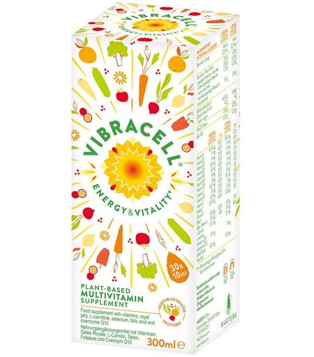 Nahrungsergänzungsmittel sind kein Ersatz für eine ausgewogene und abwechslungsreiche Ernährung und eine gesunde Lebensweise. Vibracell®Bio-Photonen für noch mehr Vitalität! Natürliches Multivitamin-Nahrungsergänzungsmittel Aus kalt gepressten Säften Spendet Vitalität und Energie Kräftige ImmunitätsboosterFür wen ist Vibracell® geeignet? Vibracell® ist ein natürliches Multivitamin-Nahrungsergänzungsmittel aus kalt gepressten Säften von sorgfältig gewählten Früchten, Gemüsen und Pflanzen, größtenteils aus kontrolliert biologischem Anbau. Weitere wichtige Nährstoffe wie Vitamine, Selen, Folsäure, Gelee Royal, L-Carnitin, Coenzym Q10,… werden hinzugefügt. Vibracell® ist ... garantiert frei von Pestiziden, Herbiziden und Schwermetallen. Aus zertifiziertem biologischem Anbau im Rahmen des Möglichen (mindestens 70% des Inhalts) das Ergebnis von 10 Jahren Forschung, Erfahrung und Entwicklung 100% vom Körper aufgenommen dank der flüssigen Form spendet Vitalität und Energie kräftige Immunitätsbooster wohlschmeckend und erfrischend geeignet für die ganze Familie (Kinder ab 3 Jahren)Wie funktioniert Vibracell®? Vibracell® enthält 100% der empfohlenen täglichen Einnahmemenge an Vitaminen und liefert Energie auf Grund seiner wertvollen Bestandteile. Außerdem spendet Vibracell® den Zellen auch Schwingungs- oder Vibrations-Energie (daher sein Name). Unter jeder Flasche befindet sich ein Bio-Photonen-Energieplättchen, dass diese Vibrations-Energie noch weiter erhöht. Werfen Sie das Energieplättchen nicht weg, sondern legen Sie es unter Ihre Nahrungsmittel und Getränke, damit diese sich auch energetisch aufladen können. Wie wird Vibracell® angewendet? Jeden Morgen zwei TeelöffelVibracell® in ein Glas Wasser für eine optimale Vitalität! Sie trinkenVibracell® am besten morgens vor dem Frühstück: zwei Teelöffel (= 10 ml) Vibracell® in ein Glas Wasser (= 120 ml). Kinder (3 - 12 Jahre) nehmen 5 ml pro Tag. Falls es Ihr Arzt oder Ernährungsberater nicht anders empfiehlt. Die Flasche vor dem Gebrauch gut schütteln und das trinkfertige Produkt mit einem Plastiklöffel umrühren (weil Metall die Vibrations-Energie vernichtet). Nach dem Öffnen, die Flasche im Karton im Kühlschrank aufbewahren und innerhalb von 2 Monaten aufbrauchen. Das Biophotonen Energieplättchen unten im Karton stimuliert so den Flascheninhalt. Zur Unterstützung der Regeneration der Zellen (innerhalb von 90 Tagen), empfehlen wir mindestens zweimal im Jahr (Frühjahr und Herbst) eine Vibracell®-Kur von 3 Monaten. Ideal ist natürlich täglich Ihr Glas Vibracell®!Zutaten:Konzentrierte Säfte (61,3%) aus: Orange, Aprikose, Karotte, Passionsfrucht, Zitrone, Holunder, schwarze Johannisbeere, Heidelbeere; Fruktose, Säfte aus laktofermentiertem Gemüse (6%) sowie: Weißkohl, Rotkohl, Karotte, Rote Bete, Fenchel, Ingwer; Trockenextrakte (3%) aus Kamille (Matricaria chamomille L.), Zitronenmelisse (Melissa officinalis L.), Hagebutte (Rosa canina L.), Brennessel (Urtica dioica L.), Artischocke (Cynara scolymus L.),... ...