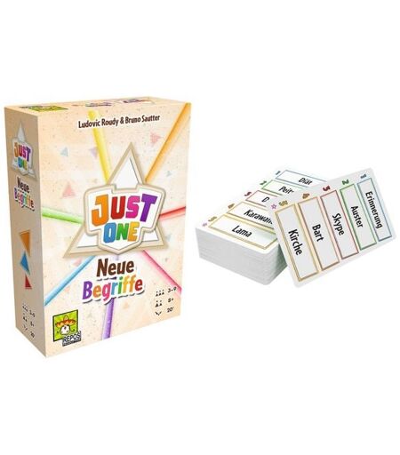 Das Wort ist „Skype“. Was ist eure erste Assoziation, wenn ihr das Wort lest? Denken eure Mitspieler in die gleiche Richtung wie ihr? Oder habt ihr alle andere Vorstellungen, womit man dieses Wort beschreiben könnte? Sobald ein Mitspieler die gleiche Idee hatte wie ihr, ist euer Wort raus und euer Mitspieler hat weniger Möglichkeiten, auf das Wort zu kommen. Also trefft eure Wortauswahl geschickt. Denn es gibt nur eins – Just One! Erlebt mit Just One – Neue Begriffe noch mehr Just One-Spielspaß mit über 500 neuen Begriffen und bis zu neun Spielern! Just One ist ein kooperatives Partyspiel, bei dem alle zusammen gegen das Spiel spielen. Das Ziel ist es, gemeinsam möglichst viele der 13 geheimen Wörter zu erraten. In jeder Runde versucht einer als aktiver Spieler ein geheimes Wort zu erraten. Dabei helfen die anderen Spieler, indem sie verdeckt und ohne sich abzusprechen, je einen Hinweis auf ihre Tafeln schreiben. Just One ist auch Teil der Asmodee-Kampagne Connect & Play, mit der wir Anleitungen zum Spielen über Videochat bereitstellen. Ein Grundspiel Just One wird zum Spielen benötigt. ...