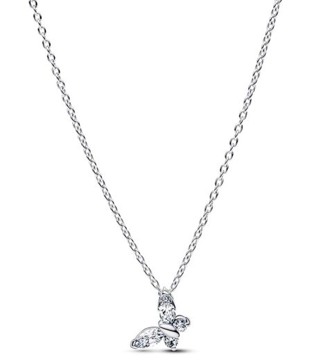 Pandora Halskette – Spreize deine Flügel mit elegantem Glanz Verwandle deinen Look mit dieser zauberhaften Pandora Halskette aus hochwertigem Sterling-Silber. Der filigrane Schmetterling ist mit funkelnden, birnenförmigen klaren Kristallen im Marquise-Schliff besetzt und zieht alle Blicke auf sich. Material: Sterling-Silber – bekannt für sein kühles, glänzendes Finish Steine: Klare künstliche Cubic Zirkonia im Marquise-Schliff für facettenreiches Funkeln Länge: Verstellbar auf drei verschiedene Längen für individuelle Tragevarianten Maße des Anhängers: 4,3 mm tief, 13 mm hoch, 11,9 mm breit Handarbeit: Sorgfältig von erfahrenen Kunsthandwerkern gefertigt Diese exklusive Halskette kombiniert zeitlose Eleganz mit verspieltem Charme. Dank der verstellbaren Kettenlänge passt sie sich deinem Stil flexibel an und wird so zu deinem ganz persönlichen Highlight. Pflege deinen Schmuck sorgfältig, indem du das natürliche Anlaufen des Silbers bei Bedarf vorsichtig entfernst – so bleibt deine Halskette dauerhaft makellos. ...