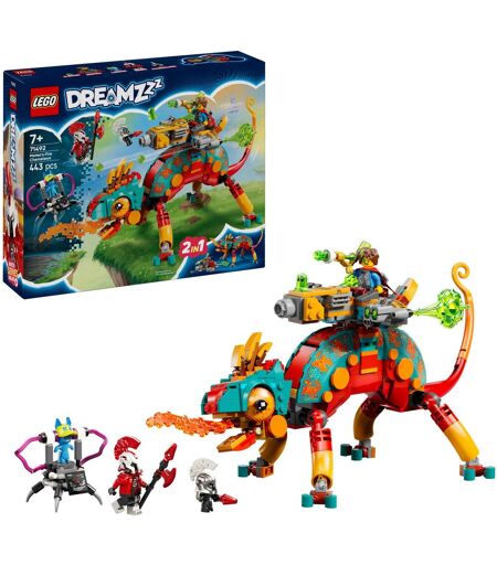 LEGO DREAMZzz Mateos Feuer-Chamäleon ist ein Bau- und Spielset für Kinder ab 7 Jahren. Jungen und Mädchen können sich mit Mateo verbünden, um Logan aus den Fängen des Bösewichts Zero zu befreien. Zuerst können sie das Chamäleon bauen und es dann entweder in ein Feuer-Chamäleon mit montiertem Blaster und 4 Shootern oder in einen schnellen Jet und einen Mini-Mech verwandeln. Das Chamäleon kann Maul, Kopf, Schwanz, Augen und Beine bewegen. In beiden Ausführungen verfügt das Modell über viele coole Details wie Booster-Module. Die Minifiguren Mateo und Zero sowie die Figuren Logan, Z-Blob und der Cyberling erwecken die Geschichte zum Leben. ...