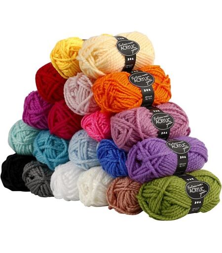 Das Set enthält 20 Knäuel Wolle mit je einer Länge von 35 Metern bzw. einem Gewicht von 50 g. Sortiment mit 2-fädiger 100% Polyacryl Wolle (Maschenprobe: 10 M x 10 Reihen = 10 X 10 cm mit Nadel Nr. 9). Enthalten sind die Farben rosa, fuchsia, pink, türkis, creme, hellblau, Meerblau, hellgelb, hellrot, weiß, gelb, neonorange, pulver, neonpink, rot, lila, mittelblau, grün, grau und schwarz. Das Set eignet sich für Schulen, Kindergärten oder Strick-Workshops. ...